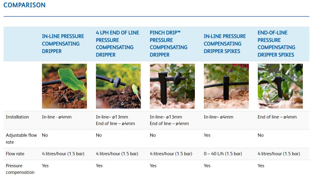 - Self-regulating dripper that gives a constant flow rate of 4 lph, regardless of water pressure. Flow based on 1.5 bar pressure.