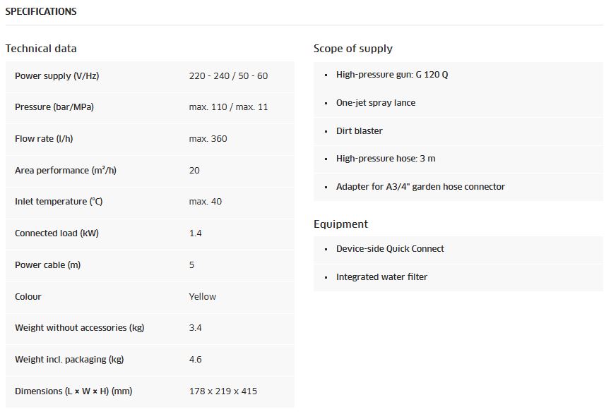 Equipped with a Quick Connect trigger gun, 4 m high-pressure hose, single spray lance, dirt blaster and water filter, the K 2 Compact is ideal for occasional use and light dirt on garden furniture and tools, bicycles and around the house.